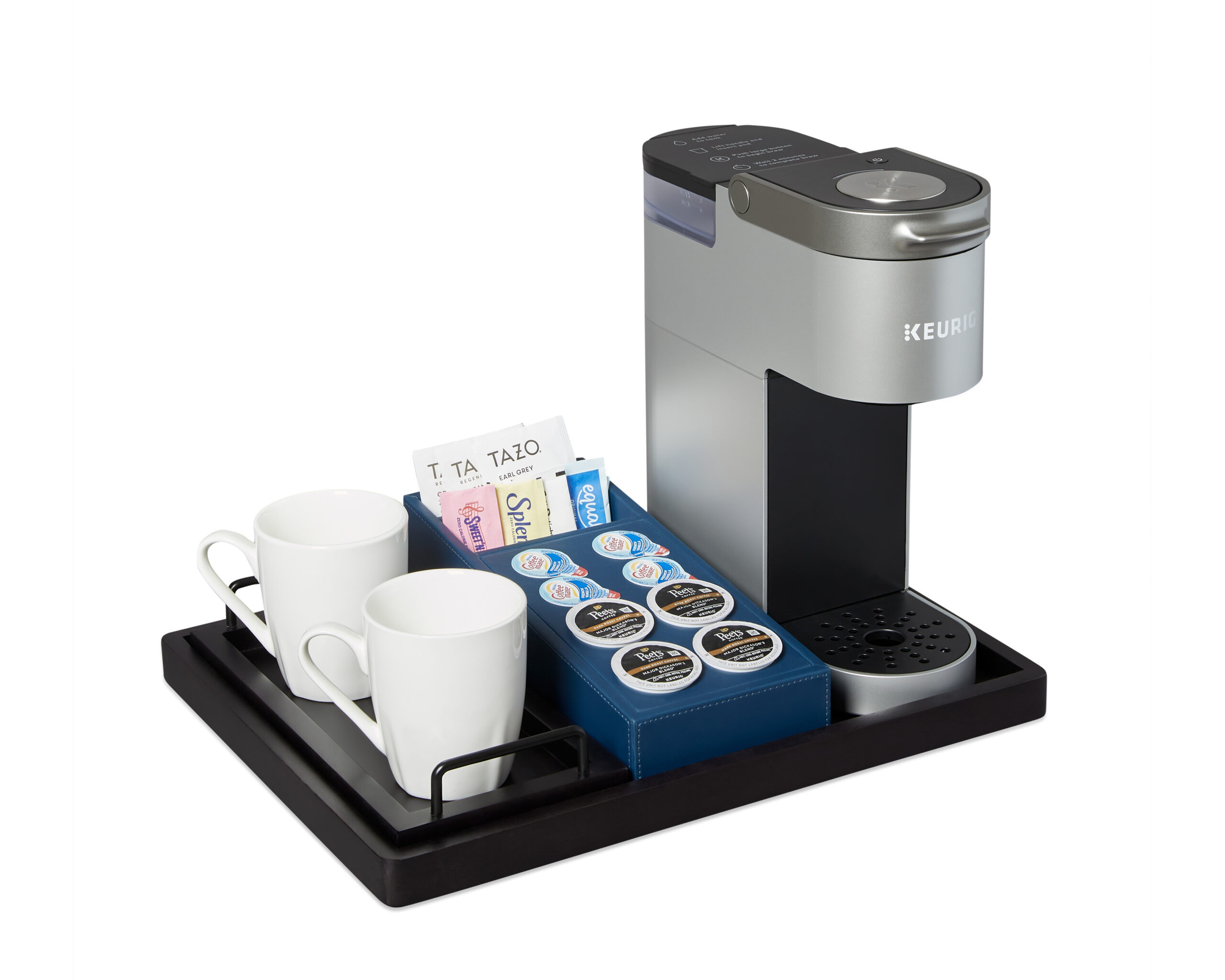 Shown in ebony stain mango wood, blue faux leather, and matte black stainless steel.